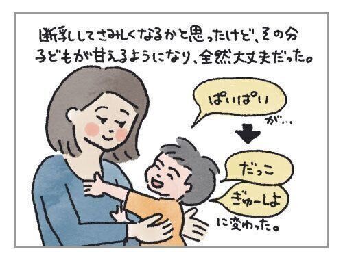 実は、断乳したらおっぱいをあげられなくなって、自分がさみしくなるだろうなーと思っていました。でも、断乳したら、その分子どもが甘えてくるようになり、全然さみしくない!