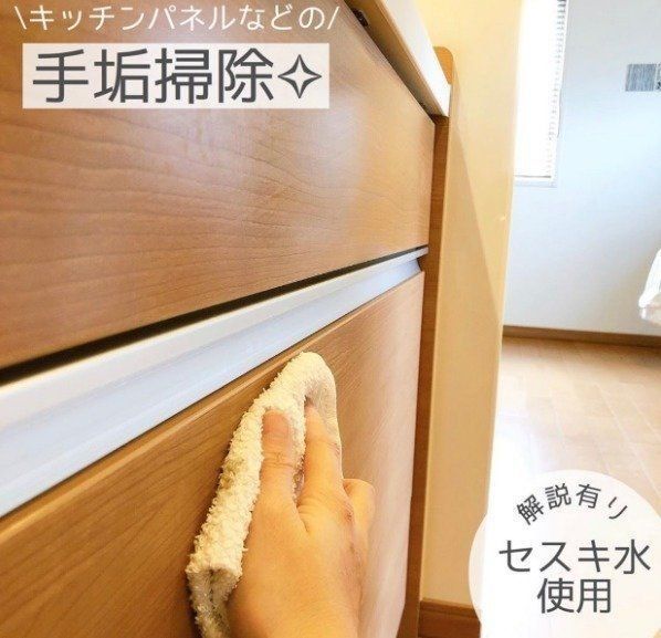 さきさんは、キッチンパネルや冷蔵庫などの手アカのこそうじ(小掃除)にセスキ炭酸ソーダを使用しているそう。時間が経って落ちにくくなった手アカも、セスキ炭酸ソーダを使えばするっと落ちるとのことです(^^)