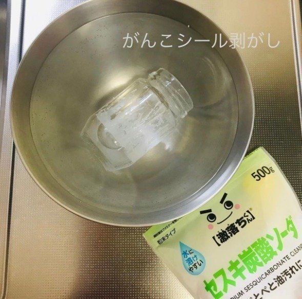 ioさんは瓶のシール剥がしにセスキ炭酸ソーダを活用。漬け置きしてから擦ると、ベタつきもなくするっとシールが剥がれてくれるそうですよ♪