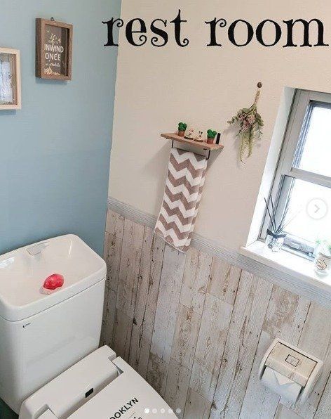 hiromiさんはトイレのインテリアを100均アイテムでアレンジ。リメイクシートを使って壁をブルーグレーにチェンジしたそう♪ フォトフレームを飾ればまるでお店のトイレのような雰囲気に(^^) 貼るだけのリメイクシートは、簡単に壁の色を変えられるのがうれしいですよね!