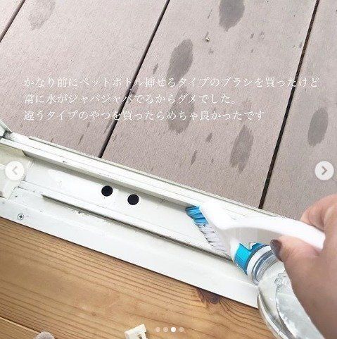 yukkoさんは、ペットボトルにつけて使うブラシを使ってサッシのこそうじ(小掃除)。水だけで十分にキレイになったそうですよ。洗剤を使わないことで、二度拭きなどの手間が省けるのがいいですよね。