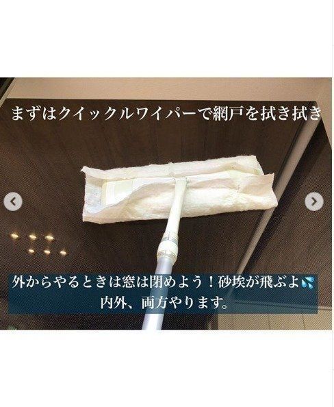 ばやしこ マイホームアカウントさんはフローリングワイパーや新聞紙を使って網戸をこそうじ(小掃除)したそう。フローリングワイパーを使うと、手で拭くより効率的にこそうじ(小掃除)を進めることができますね!