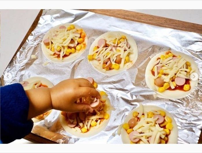 りくくんママは1歳の息子さんと親子でお料理!画像のピザは餃子の皮を使っているので、準備するのはトッピングだけ。トッピングなら1歳の子どもでも楽しんでできますよね。好きな具材を乗せたら、オーブントースターで3分焼くだけ!かんたんで美味しいピザは、ランチにもおやつにもピッタリで◎