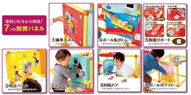 このジャングルジムのスゴイところは運動と一緒に“知育”ができるところ。歯車パネル、時計パネル、ボール型はめボックス、ボール転がりレール、指遊びボード、回転ドア、ボールポケットの7つの仕掛けパネルの取り付けができるので、飽きずにたくさん遊んでくれます。