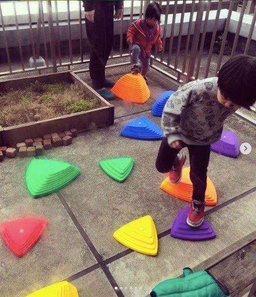 Mamikoさんがおうちでの運動遊びに使っているのは、バランスストーンというアイテム。床に置いて、飛び石のように飛び移って遊べるおもちゃなんだそう。遊びながら、バランス感覚や体幹も鍛えるのにも役立ちますね!