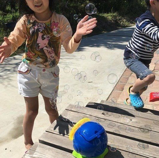 まささんはこちらの自動シャボン玉機をおうち遊びに活用!写真からも、とても楽しそうな様子が感じられますね♪