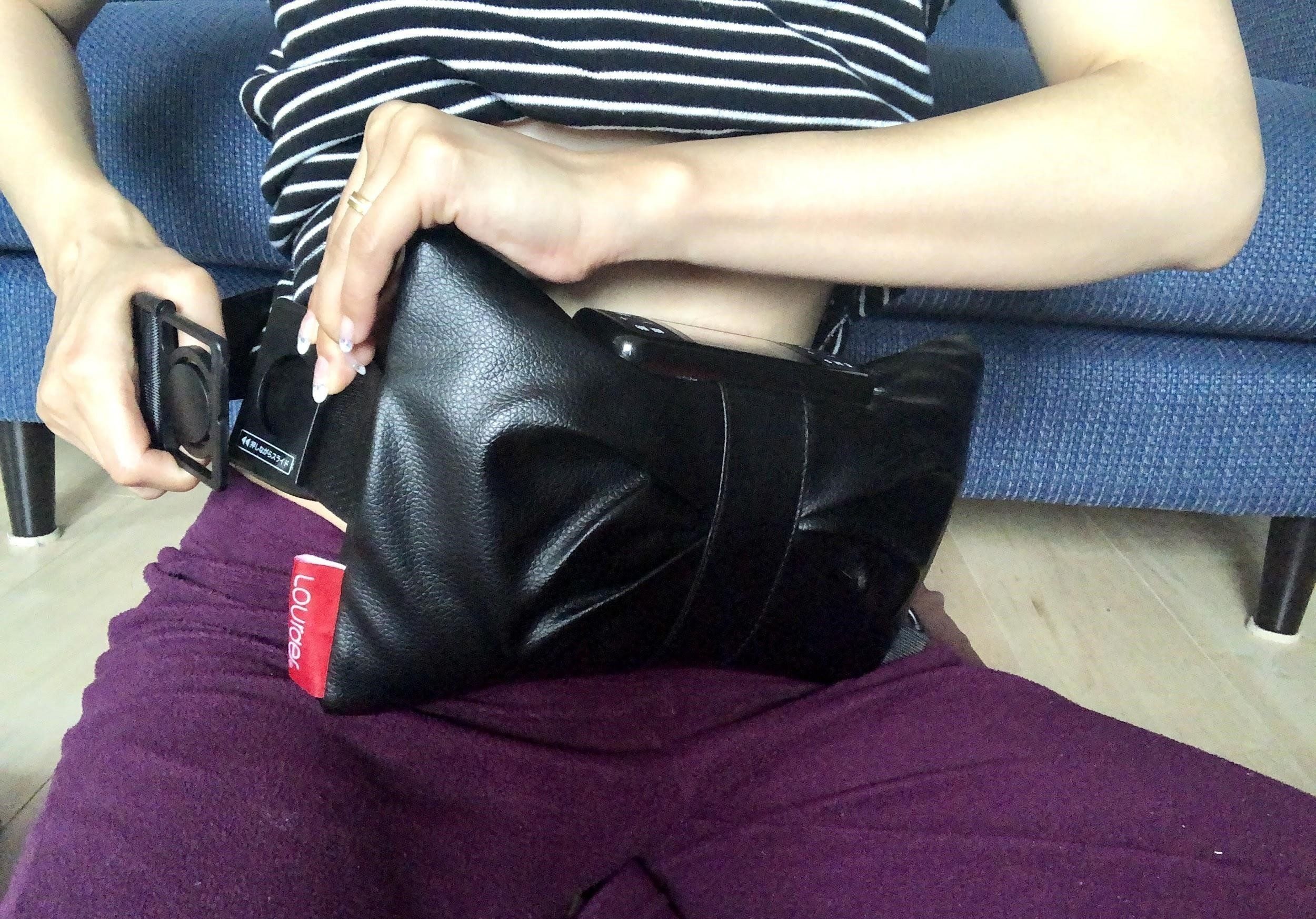 使用中はこんな感じ。ウエストは50~100cmまで対応していて、使用感は見た目以上のパワフルさで、「そう来るの!!?」という声が思わず最初は漏れてしまいました笑。けれども、毎分最大約3,700回転の振動はとても強力で筋肉がボコボコと刺激されるのを実感できます。EMSの強弱は5段階に調整でき、電流によってウエスト周りがダイレクトに揺さぶられる感じが独特。