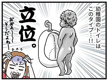 自分の意思はハッキリと伝えられる長男。家のトイレでは用を足せるのに、外でできない言い分としては、「便座の形が家と違うところではしたくない」ということでした。どんぐり型じゃないと嫌だと…。そんな屁理屈をこねているだけで、本当はちょっと勇気を出して頑張ればできると思うのですが、下手に荒療治でトイトレを進めて、ヘソを曲げると余計面倒なことになりそうで、他のお友達がカッコ良く用を足している…そんな環境が彼をやる気にさせるだろうと期待していた私です。