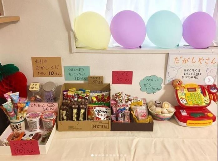 narumi.sさんは、おやつの時間を「だがしやさんごっこ」にアレンジ!お菓子を選ぶ楽しさの他にも、「これとこれでいくらかな?」「まだ買えるかな?」とお買い物の練習にもなってお勉強にもなりますね。