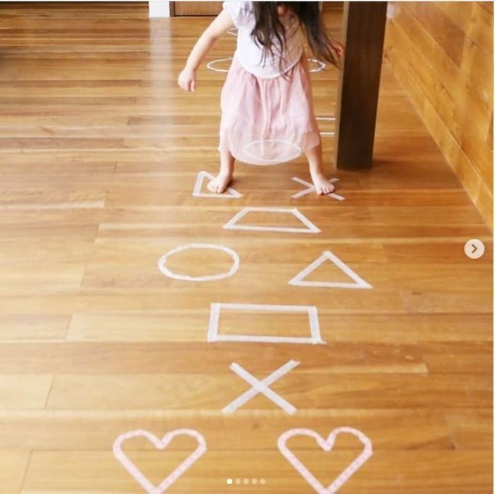 ひなた日和(ユキ)さんがおうちで楽しんでいるのは、「けんけんぱ」。マスキングテープなら、貼るのもはがすのも簡単で床も傷めませんね。〇だけでなく三角やハートなどいろいろな形で印を作れば、形の名前を覚える勉強にもなるそうですよ!