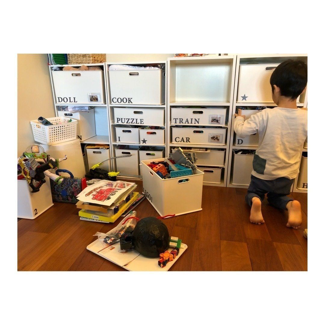子どもがおもちゃで遊ぶときは、ボックスごと出して遊ばせています。遊び終わったら、そのボックスに片づけて、自分で収納棚に戻すのがわが家のルール。「次の遊びをする前に、必ずお片づけ」を習慣にするようにしています。この写真はちょうど年末の大掃除のときのもの。ちょっとおもちゃの量が増えすぎて、収納がしづらくなってきたので息子自身に、「いる・いらない」を分けてもらいました。ボックスに収納することで、おもちゃの定量が決められるのでとても管理しやすいです。