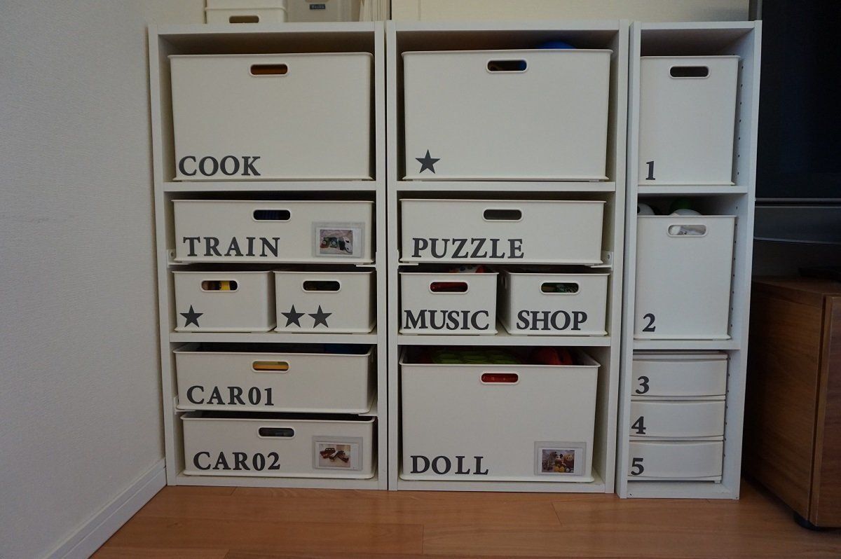 モノトーンの英語・数字ステッカーでどこに何が入っているか、一目でわかるように、ラベルシールをつけています。これは大人がまず認識しやすいように。子どもは実は何度かやるうちに感覚で場所を覚えるので、子どもが読めなくても大丈夫です。あとは場所を覚えるまでは、中に入っているおもちゃの写真を撮ってはると、とてもわかりやすいのでおすすめのテクニックです。私は子どもと一緒にその場で“チェキ”で撮影して、出てきた写真を子ども自身ではってもらうようにしています。