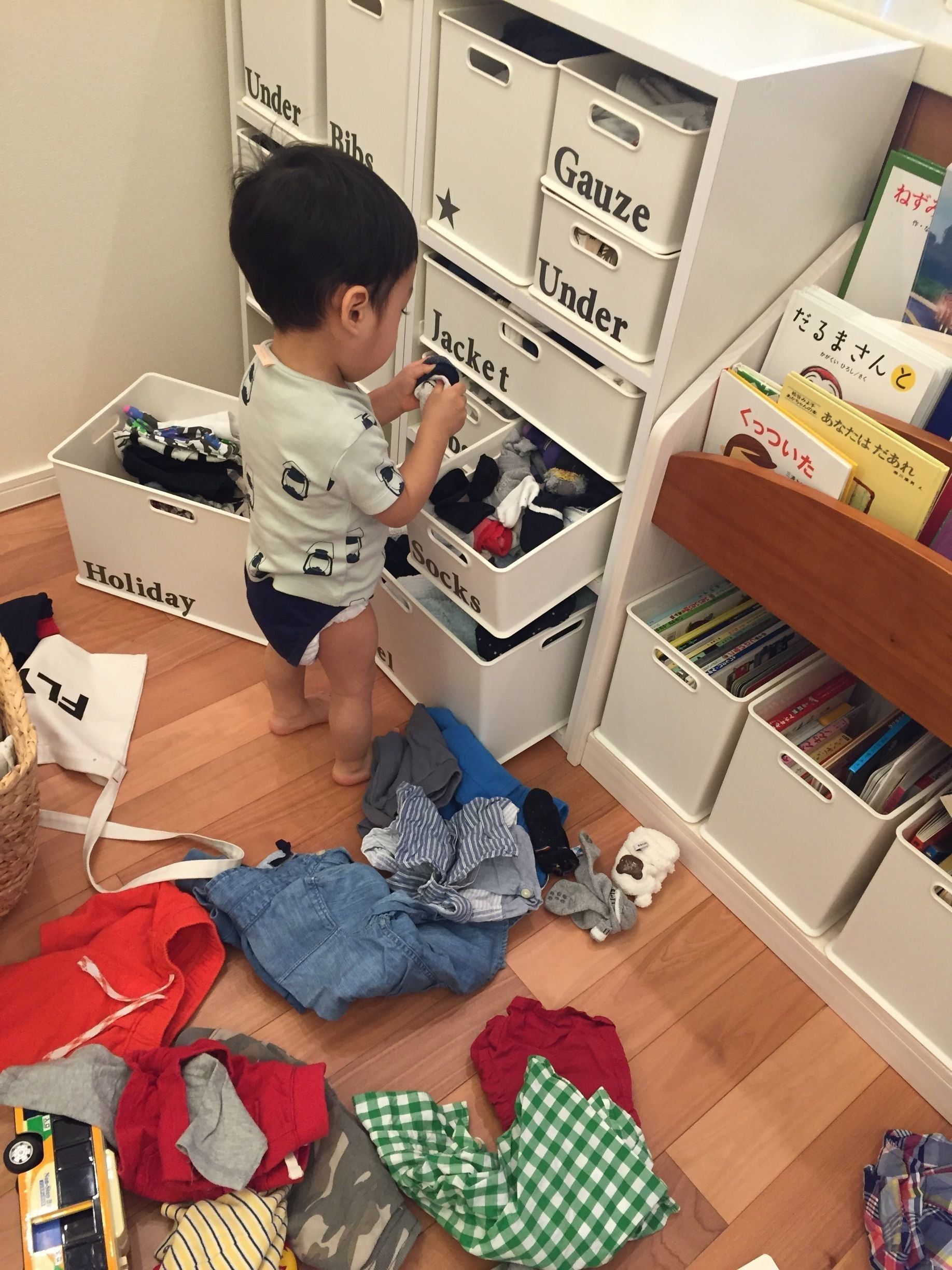 1才代になると、おもちゃや遊びなどに自分の好みが出てくるように。そのタイミングで、好きなおもちゃがどこにあるのかをなんとなく教えてあげるようにしていました。写真のようにこのころはとにかくいろいろ触って、試して、何でもぐちゃぐちゃにしたい時期。洋服などもちょっと目を離すとこのように散らかされていました(笑)。でも、片づける場所が決まっていると、片づけが簡単なのであまりストレスになりませんでした。