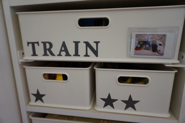 モノトーンの英語・数字ステッカーでどこに何が入っているか、一目でわかるように、ラベルシールをつけています。これは大人がまず認識しやすいように。子どもは実は何度かやるうちに感覚で場所を覚えるので、子どもが読めなくても大丈夫です。あとは場所を覚えるまでは、中に入っているおもちゃの写真を撮ってはると、とてもわかりやすいのでおすすめのテクニックです。私は子どもと一緒にその場で“チェキ”で撮影して、出てきた写真を子ども自身ではってもらうようにしています。