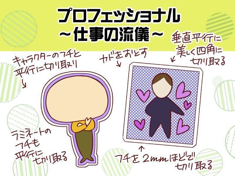 お気に入りのキャラクター雑誌などのイラストを、キャラクターの輪郭外1,5ミリをカッターで切り抜き、台紙に貼りラミネート後、美しくカットするのである。オタクの所業である。私はこの道30年の職人なので一連の作業、完成品には自信がある。春季ラミカ作成、関東大会、女子、40代部門でも相当良いセンまでイケる自信がある。40代、30代部門といえばラミカの激戦区である。その中で上位に食い込むには並大抵のキャリアでは到底及ぶべくもない。その中で戦う自信が…私にはその力があるのだ。今、その実力を遺憾なく発揮し、ラミカを量産している。特に使い道はない。見て愛でるだけの品物である。