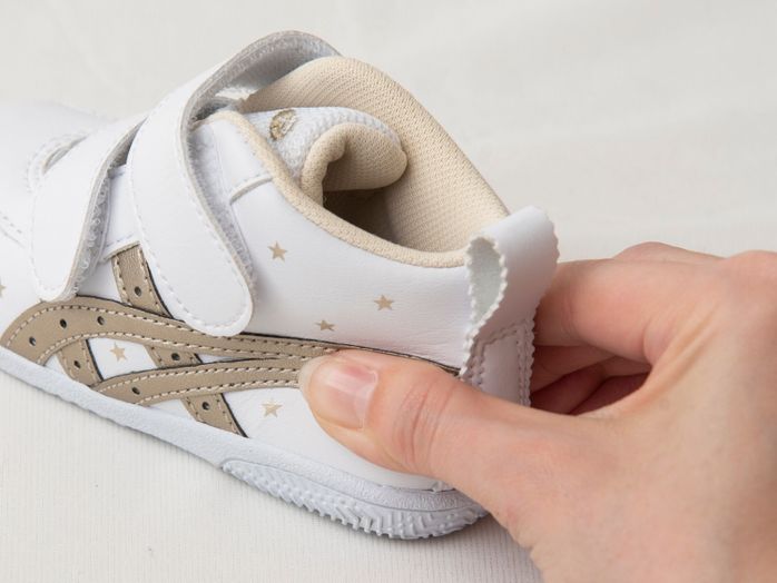 やわらかい足首を支えるために、靴のかかと部分を押してもぐにゃっとつぶれない、かたい芯が入ったものを選びます。かかと部分を大人の指で押さえて、つぶれないか確認しましょう。