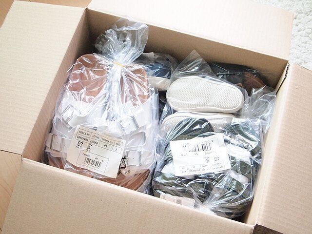 靴は一足一足ビニールに入っていて、靴の中には型崩れしないように詰め物が入っています。靴の箱は処分に困るので個人的に箱なしはうれしいですが、靴同士の重みで型崩れしやすいと思うので、届いたら段ボールからすぐに取り出した方が良さそう。