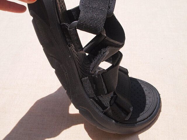 これぐらいのお値段のスポサンはまれに見かけますが、大抵はビーチサンダルのようにのっぺりとした靴底。それに比べてこのスポサンは靴底に厚みがあり、足にフィットするような設計になっています。靴底も柔らかく、面ファスナーで自分の足のサイズに合わせられるのでストレスなく履けました。これなら幅広・甲高の人も安心です。