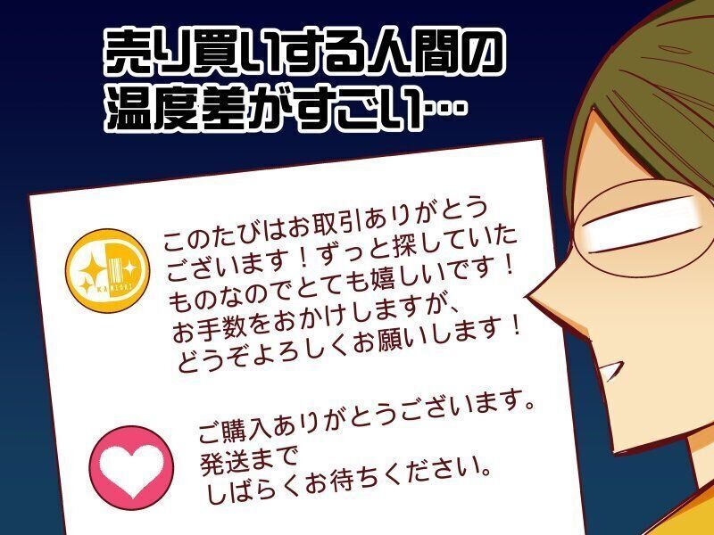 さて売主のほうはといえば不用品をあわよくば金に換えてやろうと思っているだけなので『ご購入ありがとうございます。発送までお待ちください。』という温度ゼロのテンプレメッセージを送ってくるわけである。わかる。私も送ったから、わかる。