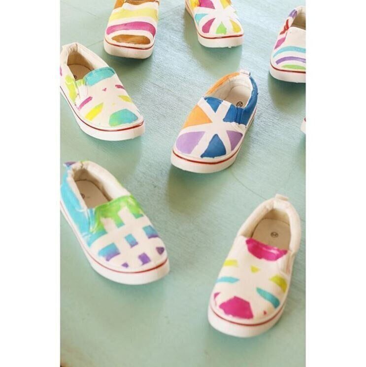 アトリエカラフルアートスクールさんが紹介してくれているのは、アクリル絵の具とマスキングテープを使ったスニーカーペイント。マスキングテープを貼っておいた場所の模様と、カラフルな色がとてもポップで素敵な仕上がりですよね。世界に一足しかない自分の靴ができたら、子どもも喜びそう♪