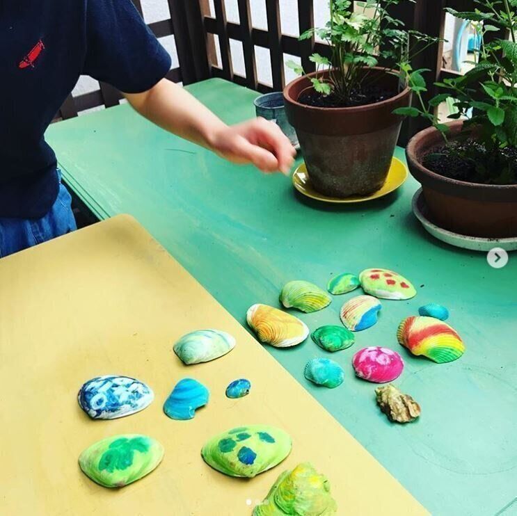 rito.art2020さんがお子さんと楽しんだのは、貝殻アート。拾ってきた貝殻に絵の具でペイントしたものだそうですが、子どものポップな感性でいろいろな色や模様が描かれ立派なアート作品に!そのまま玄関やリビングに飾っても素敵ですよね。