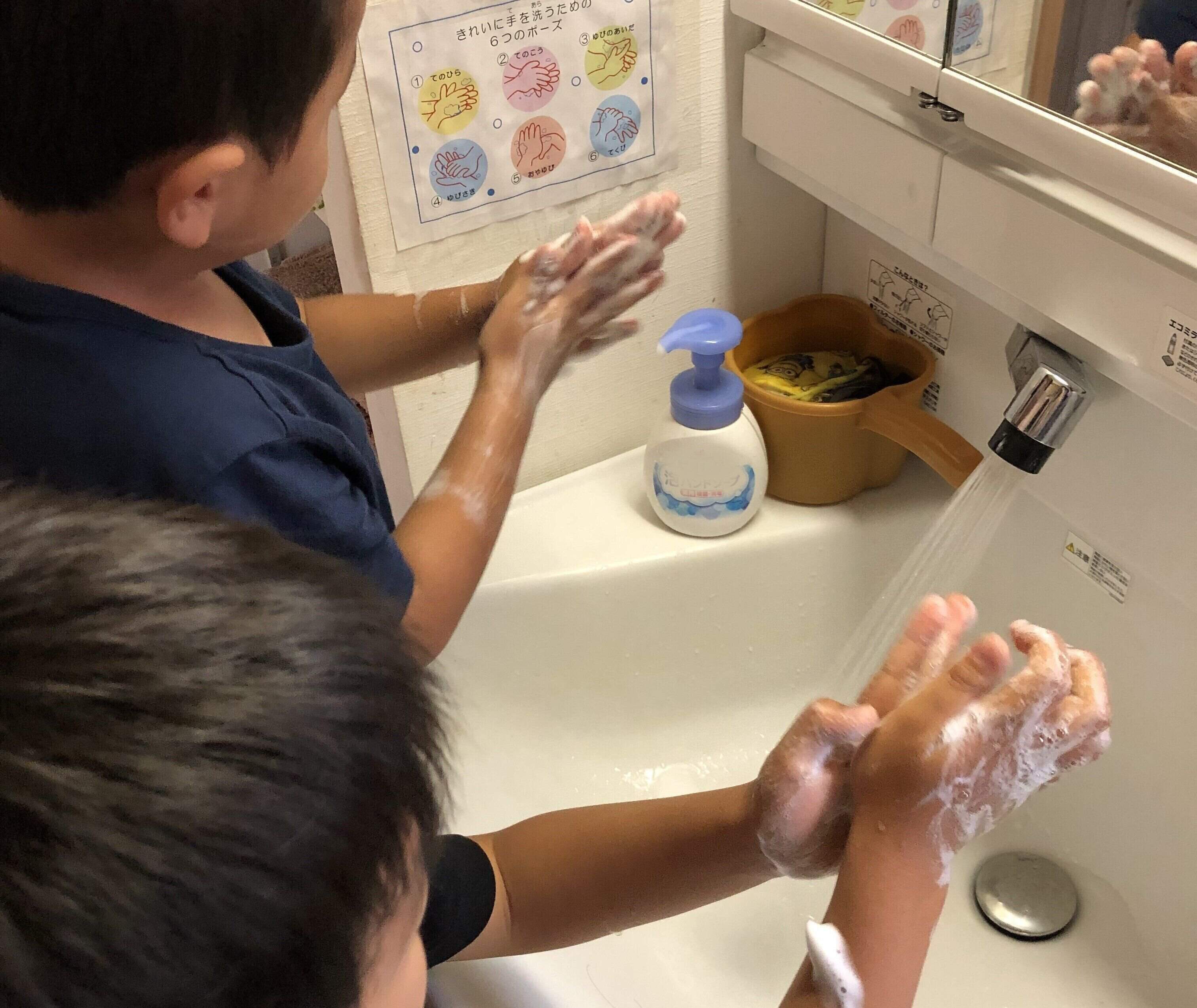 子どもたちには、手洗いを徹底。子どもにもわかりやすいよう手洗いの絵を貼り、私も一緒に手洗いをしてきちんと洗えているかをチェックしています。手をふくときはおしぼりタオルを1人1回1枚ずつ使用し、使ったタオルは洗濯機へ。