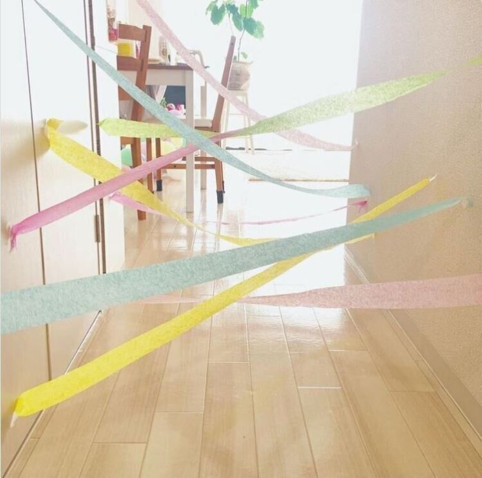 カラフルな紙テープが見た目にもかわいい「室内ジャングル」を紹介してくれたのは、広島初!パーティープランナーさん。紙テープを貼ったら、それを触らないようにくぐったりまたいだりして通り抜ける遊びだそうです。頭も身体もたくさん使って、さらに楽しそうですよね。貼り付けるテープは引っ掛かっても破れるように、紙テープや新聞紙を切ったものなどを使ってくださいね。
