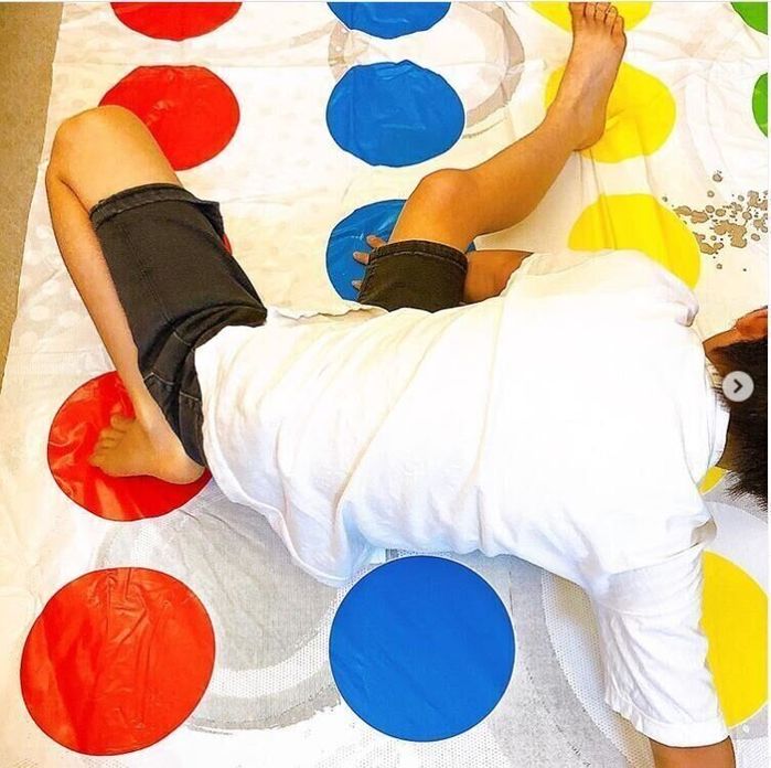 ツイスターゲームを親子で楽しんでいるのは、子ども教育アドバイザー岩田かおりさん。筋力だけではなく身体の柔らかさや体重が重要なゲームなので、親子対決では子どもの方が有利かも!? 腕や足がからまるポーズに家族みんなで大笑いしながら楽しんだそうですよ!
