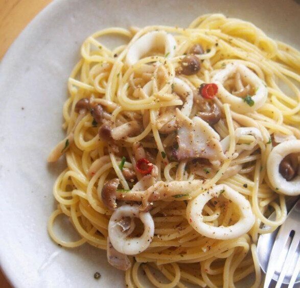 ppさんは前日のアヒージョの残りをパスタにアレンジ!こうしてアレンジすると、魚介のうまみが出たオイルをしっかり最後まで味わえるのがいいですよね♪