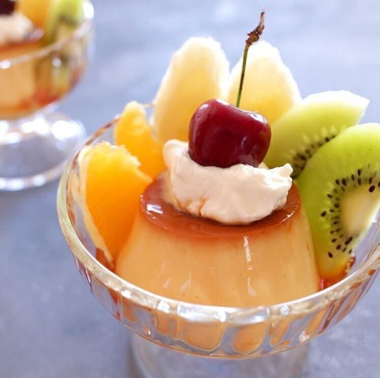 yuka**さんが手作りしたのは、プリンアラモード。手作りプリンの周りに好きなカットフルーツを飾ると、カラフルでとっても美味しそうですよね。豪華なおやつに子どもも大人も喜びそうです。器をガラス製にすれば、涼感がUPして◎