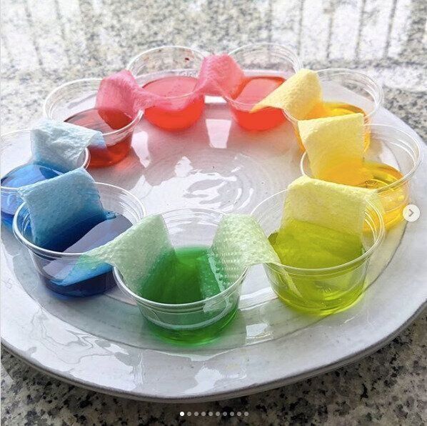 Keikoさんは、子どもたちと色水を使った遊びをしたそう。色水を入れたカップを丸く並べ、キッチンペーパーを橋渡しのようにして浸すと、徐々に綺麗な虹色に。色の変化にうっとりだったそうです。