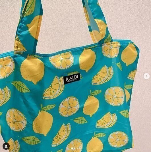 はるまきさんが購入したのは、カルディで限定販売されていたレモンバッグ。青と黄色の配色が涼しげですね。ファスナーがついているので、中の物が見えることもありません。軽くてコンパクトにたためるのも魅力です。
