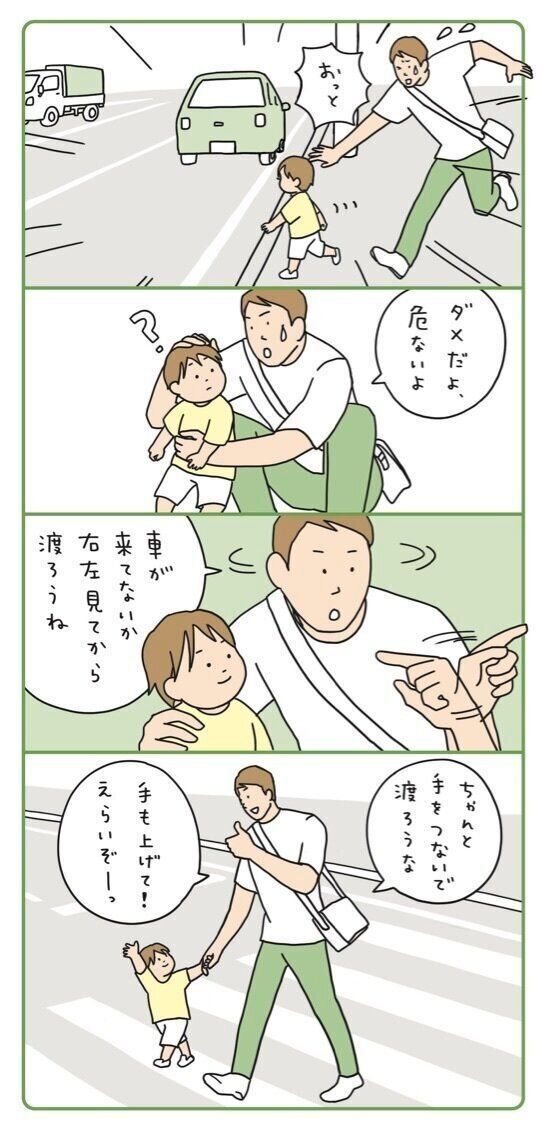 2才代も1才代と同様、危険なときは体を抱えて行動を止め、「ダメ」と伝えます。そしてダメな理由を説明しましょう。「どうしていけなかったんだっけ?」と問いかけて、やってはいけないということを思い出させてもいいでしょう。また、大人の言葉の理解が深まるので、「道路では左右を確認してから渡ろうね」などの約束事をつくるとGOOD。約束を守れたらほめることを繰り返すと、正しい行動を習慣づけしやすくなります。
