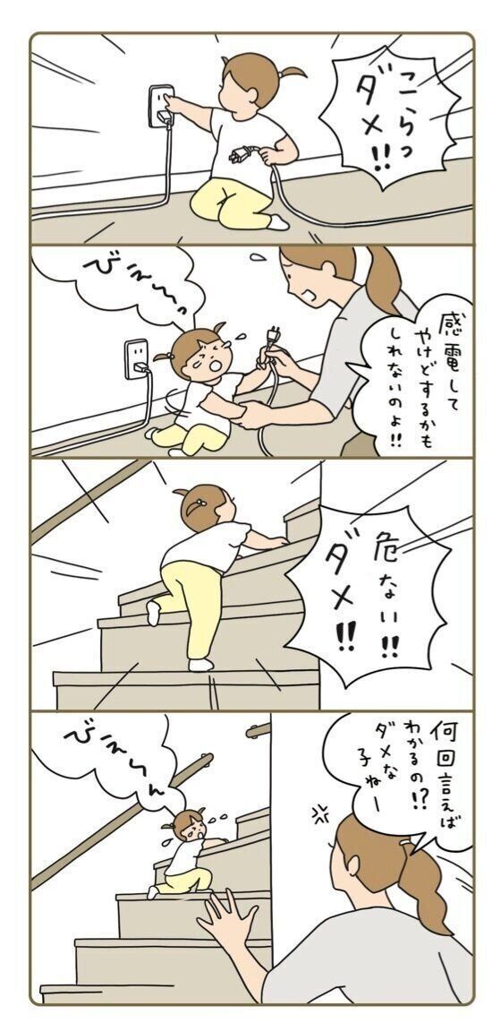子どもが危険なことをすると、親はあわててしまい、つい大声で怒鳴ったり、くどくどしかったりしがち。でも、子どもが理解できる言葉を使わないと、いくらしかっても、伝わらないそう。また、「ダメ」を連発しなくて済むように、コンセントにはカバーをする、階段にはゲートをつけるなど、安全な環境を整えることも、子どもの発達のためには大切です。