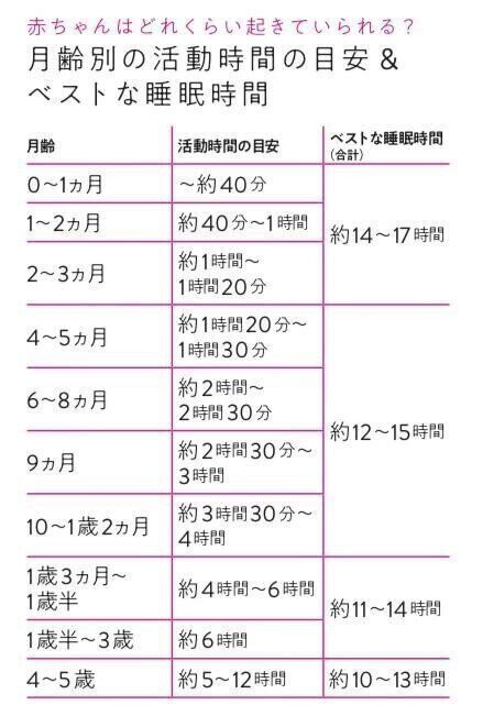 お子さんの月例に適した活動時間(起きていられる時間)を確認していただき、活動時間が大幅にオーバーしてしまわないように寝かしつけることで、その月齢に適した睡眠をとることができます。
