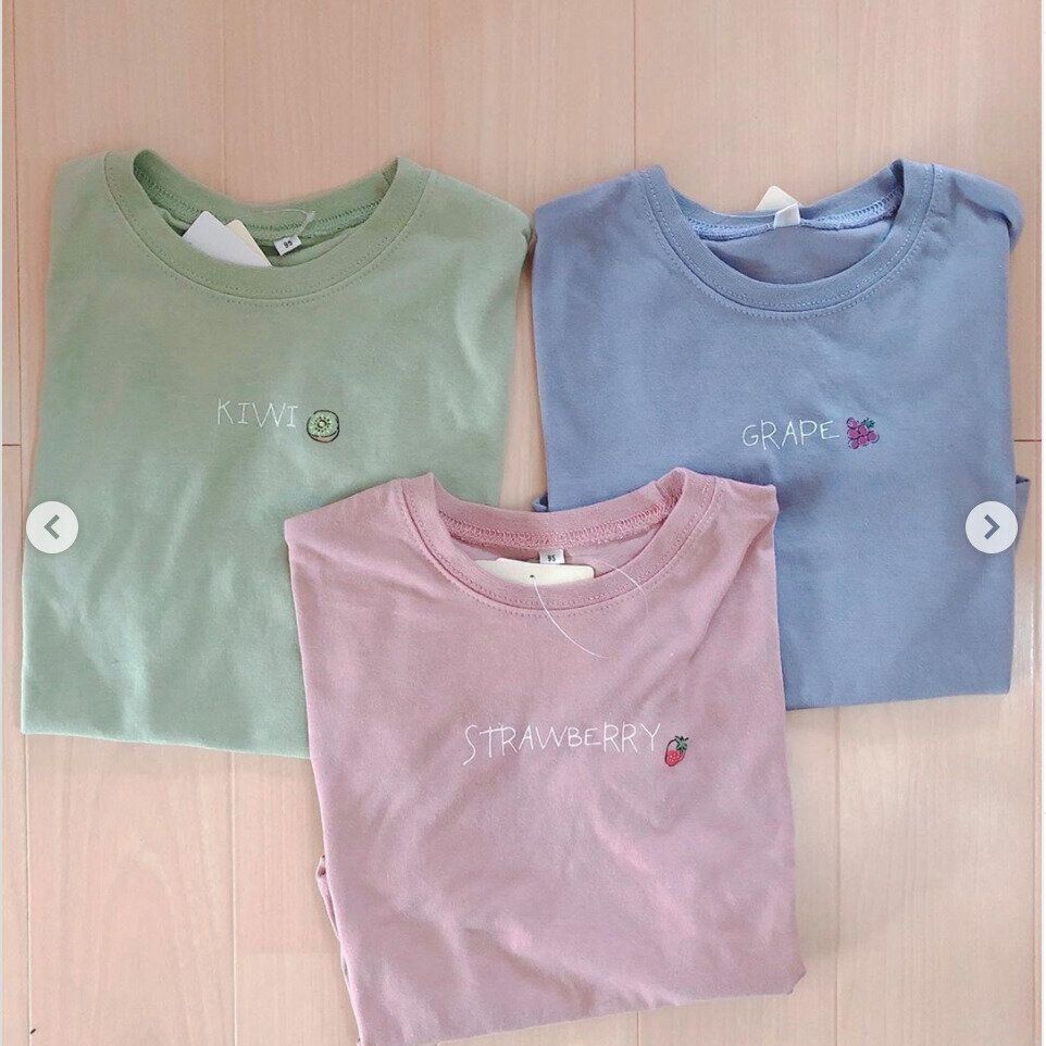 くすみカラーとワンポイントのフルーツ柄がおしゃれなTシャツを399円でゲットしたというmiffy.s2.chanさん。かわいすぎて思わず全種類買ってしまったそうです♪