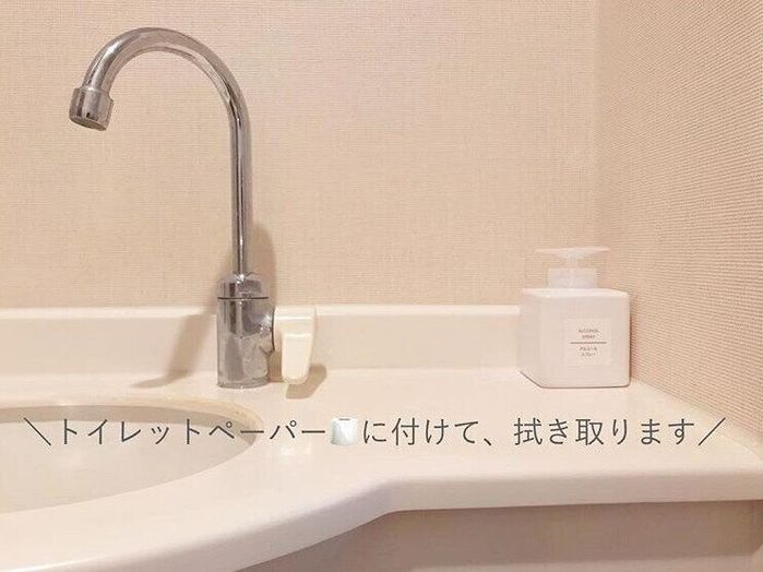 トイレットペーパーにアルコールを吹き付けてそのまま拭き取るこそうじはyukoさんのアイデア!見た目もスッキリなこの容器はセリアで買ったそうです!トイレットペーパーを使ったこそうじ(小掃除)なら気軽にできそうですよね。