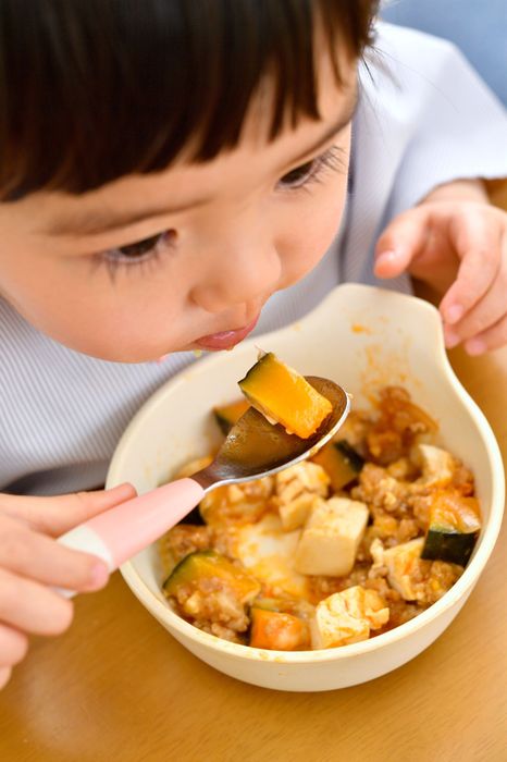 幼児食の最初のころは手づかみ食べ中心で、スプーン・フォークは1回の食事で2〜3回練習できれば十分です。食材をスプーンなどで食べやすい形状にし、少しでもできたらほめてあげましょう。嫌がらなければ親が手を添えても。