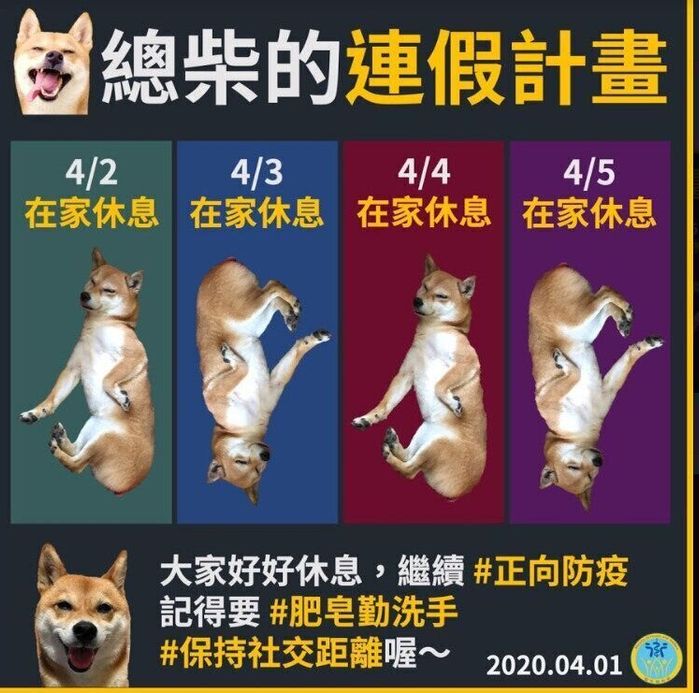 またLINE配信ではマスコットキャラクターとして柴犬を起用しており、正しい手洗いからマスク着用&検温義務を無視した場合の罰金制度まで、わかりやすく可愛らしい画像で示しています。人々の気が緩みやすい連休前など「柴犬の連休の予定:家で休憩」という画像が配信されてきたこともありました。お堅い機関がこんなにゆるい配信をするということに初めは驚きましたが、台湾人のキャラもの&カワイイもの好きな傾向を踏まえて、読んでもらうことと伝わることを目的として工夫されているんだなと感心します。