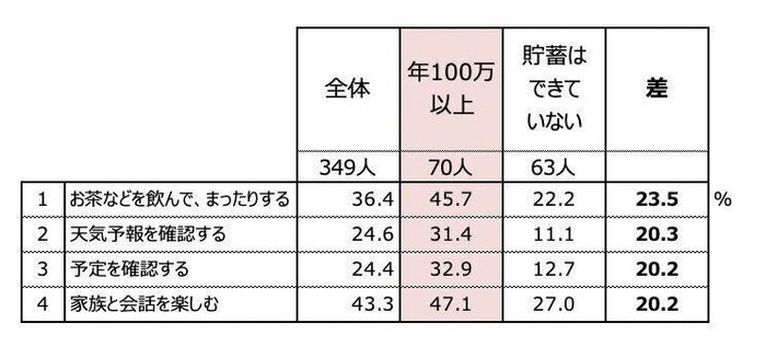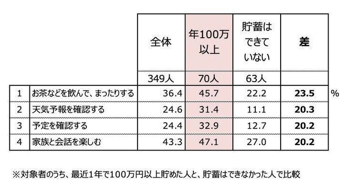 最近1年で100万円以上貯めた人と、貯蓄はできなかった人を比較してみたところ、最も差が大きかったのは、「お茶などを飲んでまったりする」でした。