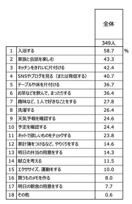 夜の習慣としては他にも「天気予報を確認する」、「予定を確認する」、「家族との会話」などがありましたが、これらは朝の習慣にもありましたので今回は割愛。