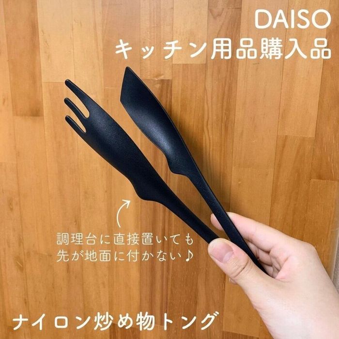 いらさんが購入したのはナイロン炒め物トング。ちょっと手を放すときに作業台に直置きしてもトングの先が直接台に触れないようになっているんだそう。これならトングを置くようのお皿を用意する必要がないので嬉しいですね。