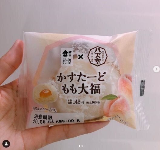 ゆりさんが購入したのは、くりーむパンの八天堂とのコラボスイーツ「かすたーどもも大福」中には桃風味のカスタードクリームや白桃ソースが入っているそうです。桃をしっかり感じられそうなスイーツですね。