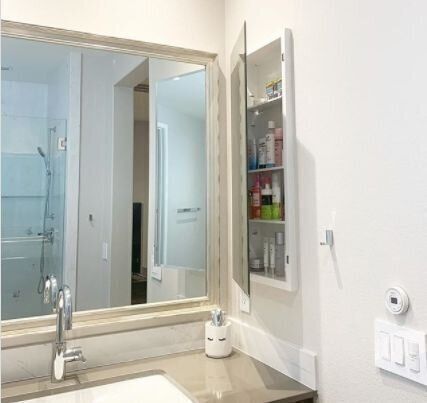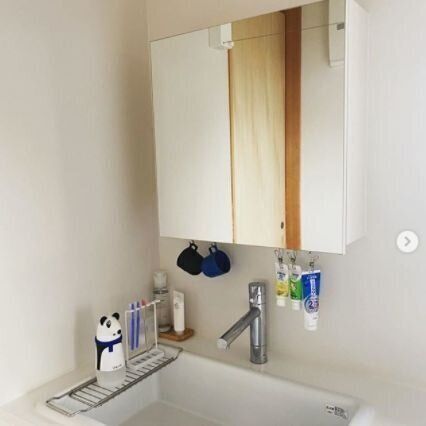 Aiさんは洗面所の鏡裏収納と洗面台下収納を活用してすっきりとした洗面所をキープしています。鏡裏は立てて収納できるボトルやチューブを収納、洗面台下にはその他のメイク道具などを収納しているそうです。物が多くなりがちな洗面所も、種類ごとにまとめるとわかりやすくなりますね。