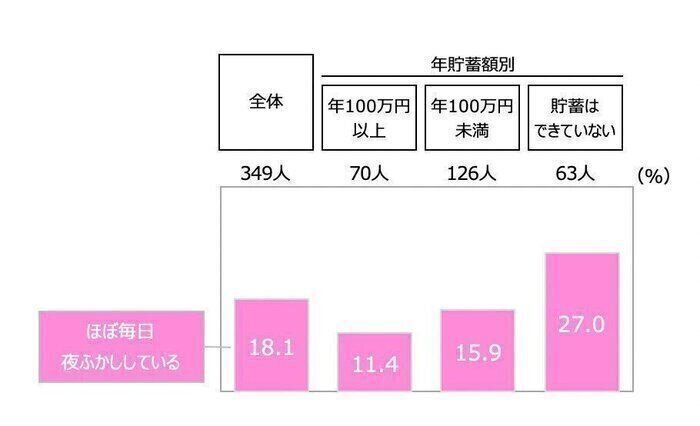 年100万円以上貯まる人では、「ほぼ毎日夜ふかししている」割合は11.4%しかいないのに対し、貯蓄ができていない人では27.3%と倍以上。間の年100万円未満では、15.9%なので、夜ふかしすればするほど、貯蓄が減るという調査結果に。