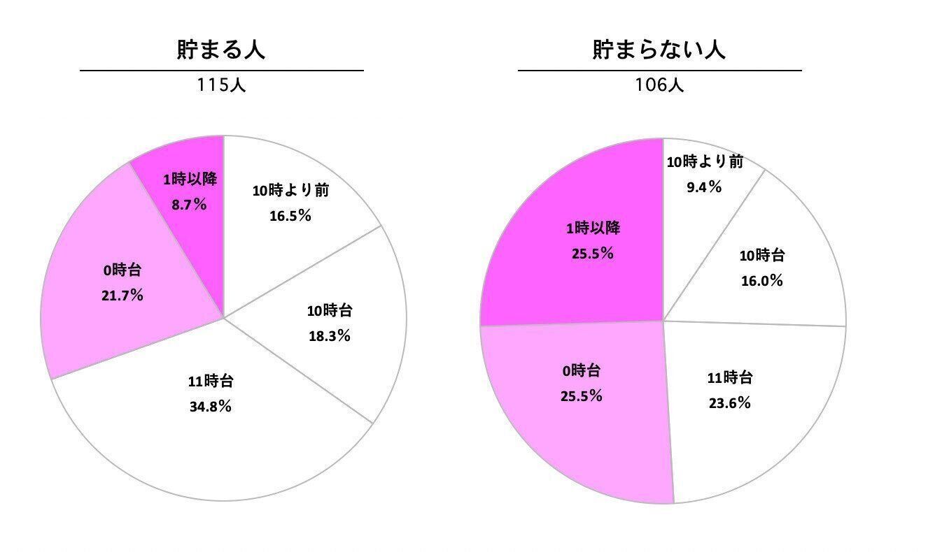 全国の既婚女性556人に調査し、貯まる人(年100万円以上&毎月貯蓄)と、貯まらない人(年40万円未満貯蓄&非毎月貯蓄)で、普段何時頃寝ているかを比較したところ、貯まる人は0時より前に寝ている人がほとんどなのに対し、貯まらない人は約半数が午前様。なんと4人に1人は「1時以降」に寝ていたのです。