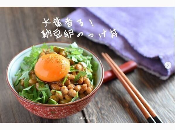大葉と納豆卵ののっけ丼を作ったえなりんさん。すべての材料は冷蔵庫から出して乗せるだけなので、包丁も使わずにどんぶりが完成しちゃいます。大葉は叩いてからちぎると香りが増して、食欲も出てくるそうですよ。彩りもきれいでおいしそうですよね。