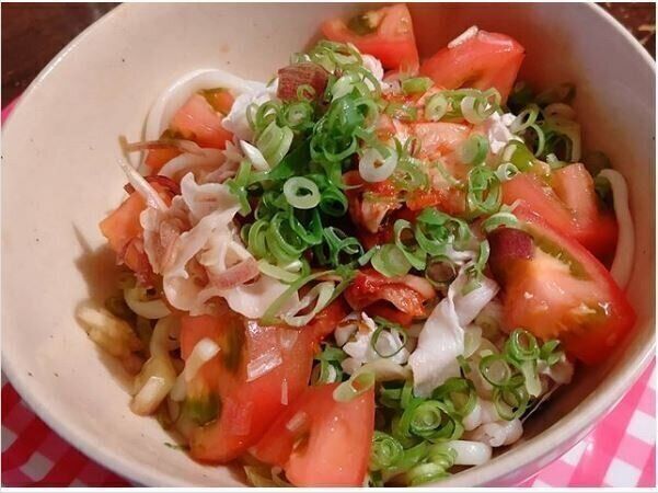 yokoさんが作ったのは、冷やしうどん。トマトたっぷりの冷やしうどんは、みょうがとネギの薬味が効いて食欲の落ちた日でも食べやすいそうですよ。うどんは流水麺を使えば茹でる必要がなく、水で洗うだけでできて時短にも◎。しゃぶしゃぶ用の豚肉を加えれば栄養バランスもよいですよね。