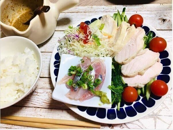 暑い日に火を使いたくないと、冷製プレートを作ったsato_c27さん。バンバンジーやアジのお刺身、モロヘイヤのお浸しと冷たくてもおいしい料理を盛り付け、冷やしたぶり大根も一緒にいただいたそうですよ。冷たいまま食べてもおいしいおかずは意外と多いので、作り置きをしておくと便利ですよね。