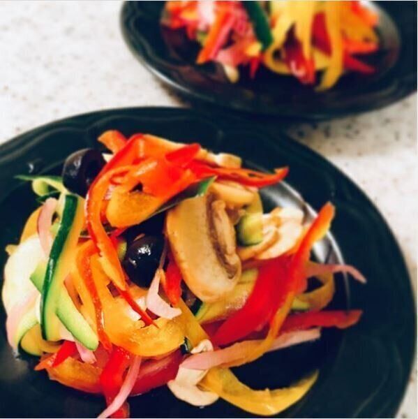 上の画像のように、彩りのきれいなサラダを作ったwaju*さん。このサラダは、半端に残った野菜を利用して作ったそうですよ。残り野菜をスライサーで薄切りにしたら、オリーブや甘酢漬けなど好みの食材と混ぜてサラダに。好みのドレッシングと和えるだけで立派な素敵な一品ができますよね。